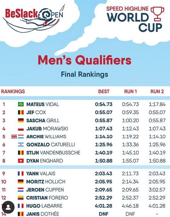 Für den Einzug ins Viertelfinale mussten die Athlet:innen aus zwei Läufen ihre beste Zeit rausholen. Moritz zeigte, dass er nicht nur ruhig, sondern auch blitzschnell über die Line fegen kann: 2 Minuten und 5 Sekunden – eine Wahnsinnszeit! Doch das Feld war dieses Jahr so stark wie selten: Yann Valais (Frankreich) und Dyan Enghard (Schweiz) zogen in der gleichen Gruppe mit geradezu absurden Zeiten vorbei – teils bis zu 15 Sekunden schneller. Doch Platz 10 von 14 ist bei diesem Level absolut respektabel. Und mal ehrlich – 2:05 auf 100 Meter Highline? Nicht viele kommen da überhaupt ans Ziel oder brauchen über 1 Stunden, wenn überhaupt!